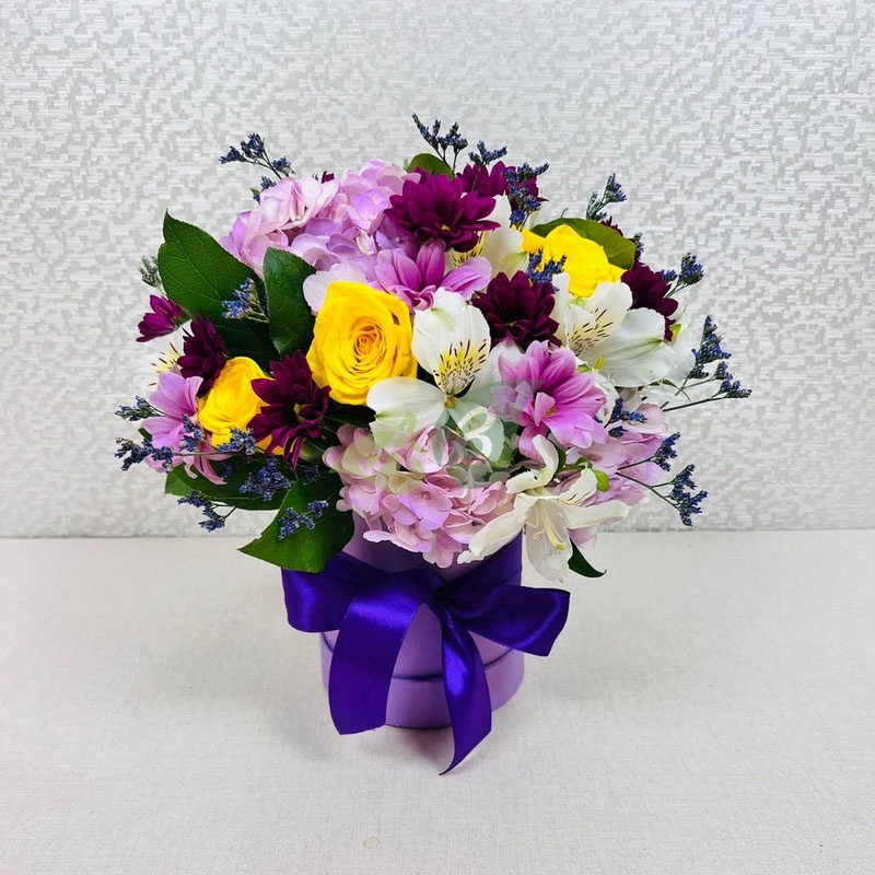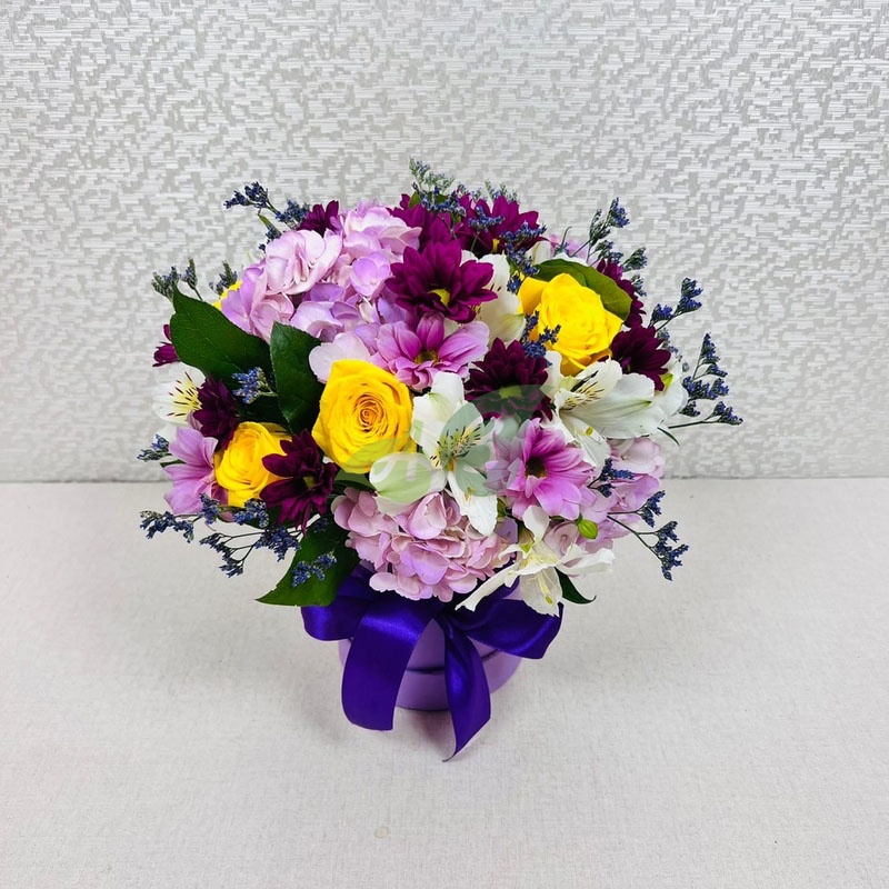 При покупке композиции из фиолетовых цветов в коробке доставка по Оби будет бесплатной.